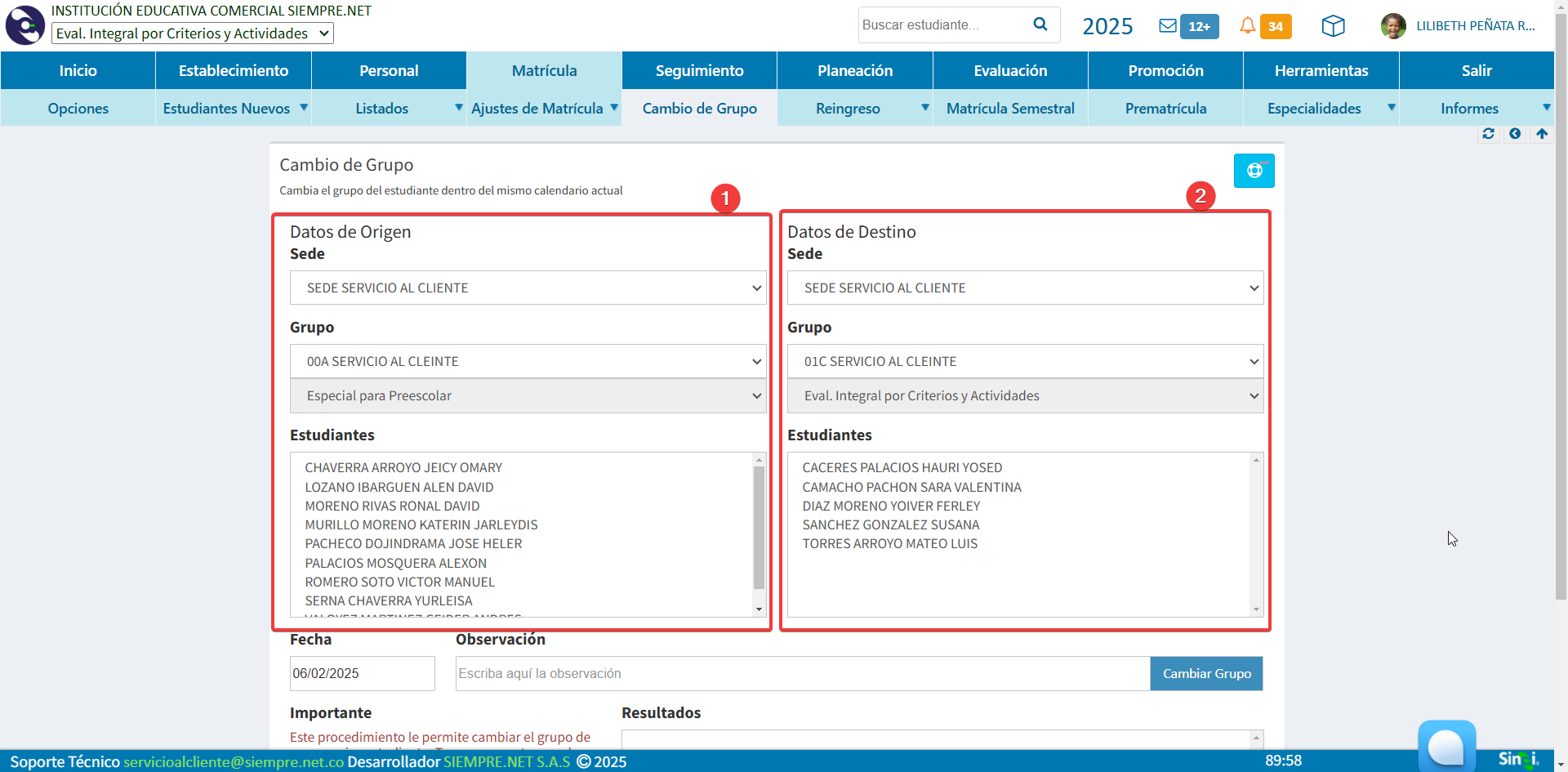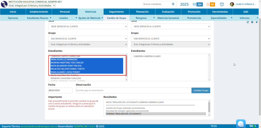 Al confirmar el cambio de grupo del estudiante, en la parte inferior derecha se mostrarán los datos del resultado, indicando:
